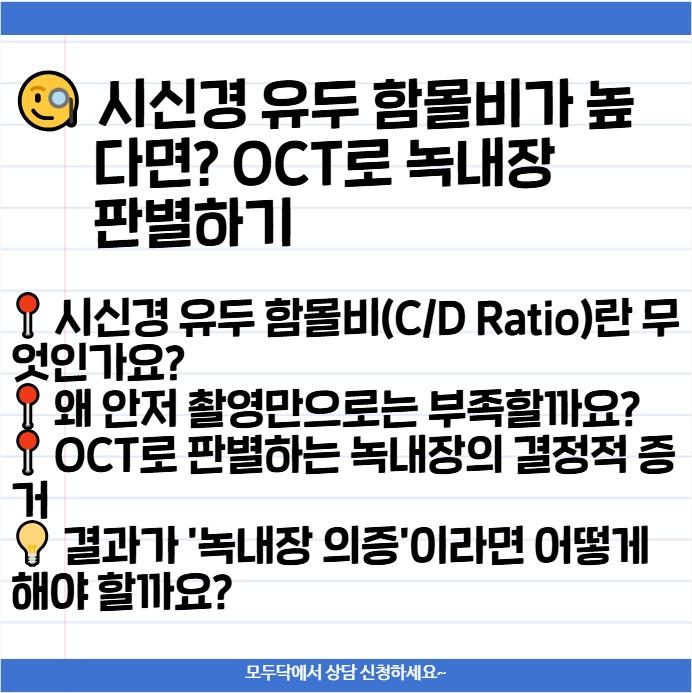 건강검진 후 결과지에서 '시신경 유두 함몰비 증가' 또는 **'녹내장 의증'**이라는 문구를 보고 놀라신 적 있으신가요? 이름부터 생소한 이 용어들이 무엇을 의미하는지, 그리고 왜 반드시 OCT(빛간섭단층촬영) 검사가 필요한지 알기 쉽게 설명해 드리겠습니다.