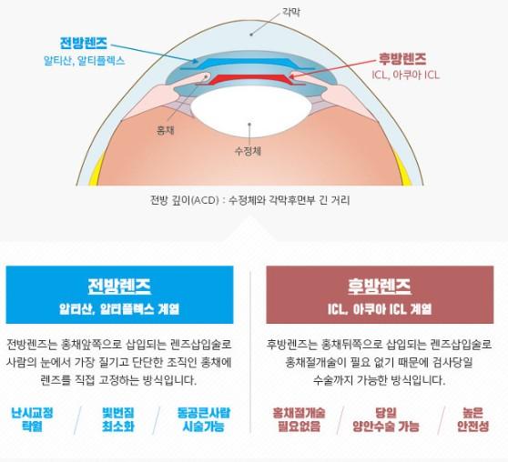 전방 렌즈(알티플렉스 등): 홍채 앞에 고정하는 방식으로 렌즈의 움직임이 적고 난시 교정에 탁월합니다. 각막 내피세포 수가 충분한 분들에게 적합합니다. 후방 렌즈(EVO+ ICL 등): 홍채와 수정체 사이에 삽입하며 외관상 티가 나지 않습니다. 최근에는 자체 구멍을 통해 방수 흐름을 원활히 하여 부작용 가능성을 0%에 수렴하도록 설계되었습니다.