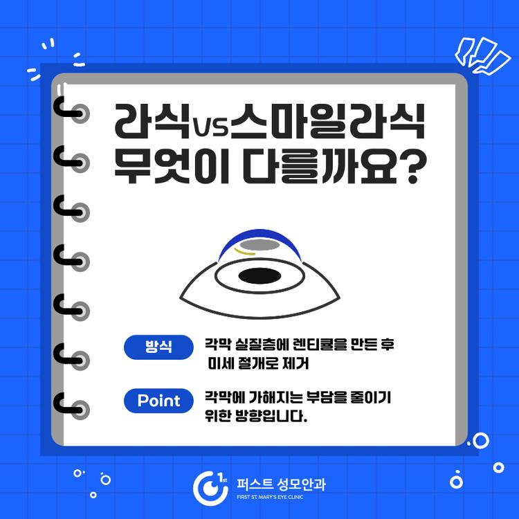 라식은 각막을 얇게 절개한 뒤 각막 안쪽에 레이저를 조사해 시력을 교정하는 방식입니다. 절개한 각막을 다시 덮는 구조로 인해 수술 후 시야 회복이 비교적 빠르게 느껴지는 경우가 많습니다. 스마일라식은 라식의 개념을 바탕으로 발전한 방식으로, 각막 안쪽 실질층에 렌티큘을 만든 뒤 작은 절개를 통해 이를 제거합니다. 절개 범위가 작아 각막 부담을 줄이기 위한 방향으로 발전한 수술입니다.