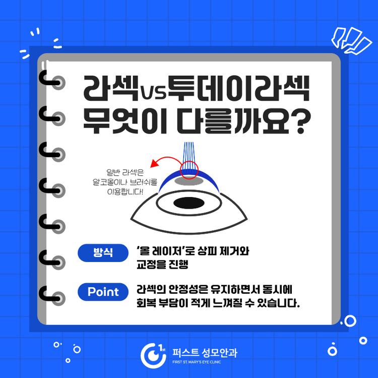 라섹은 각막의 가장 바깥층인 상피를 제거한 뒤 레이저로 시력을 교정하고 상피가 재생될 때까지 회복을 기다리는 방식입니다. 각막을 절개하지 않는 구조이기 때문에 구조적 안정성을 중요하게 보는 경우 선택됩니다. 투데이라섹은 라섹의 원리는 유지하면서 올 레이저 방식으로 상피 제거부터 교정까지 진행합니다. 이로 인해 회복 과정이나 수술 후 불편감이 수술 방식에 따라 다르게 느껴질 수 있습니다.