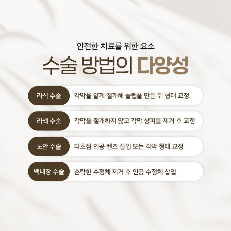 현대에는 다양한 시력 교정 강남안과수술 방법들이 개발되어 각기 다른 조건과 요구에 맞는 선택이 가능해졌습니다. 대표적인 시력 교정 수술로는 라식, 라섹, 노안 수술, 백내장 수술이 있으며, 각 강남안과수술 방법은 고유한 특징과 장단점을 가지고 있는데요. 라식 수술은 각막을 얇게 절개하여 플랩을 만든 뒤, 레이저를 사용해 각막의 형태를 교정하는 방식입니다. 이 방법은 빠른 회복과 적은 통증이 특징으로, 수술 후 몇 시간 내로 일상적인 활동이 가능해지는 장점이 있는데요. 그러나 각막 두께가 얇거나 심각한 시력 문제가 있는 경우에는 적합하지 않을 수 있으며, 드물게 눈 건조증이나 시력 불안정이 발생할 수 있는 단점이 있습니다. 라섹 수술은 라식과 유사하지만, 각막을 절개하지 않고 각막 상피를 제거한 후 레이저로 교정하는 방식입니다. 각막이 얇거나 라식이 적합하지 않은 환자에게 유리하며, 각막 절개로 인한 부작용이 없는데요. 그러나 회복 기간이 더 길고, 강남안과수술 후 며칠간 통증을 경험할 수 있으며, 초기 시력 회복이 다소 더딘 점이 단점입니다. 노안 수술은 나이가 들면서 발생하는 근거리 시력 저하를 교정하는 방법으로, 주로 다초점 인공 렌즈를 삽입하거나, 각막의 형태를 교정하여 시력을 개선하는데요. 이 수술의 장점은 나이가 들면서 발생하는 근거리 시력 문제를 개선할 수 있다는 점으로, 강남안과수술 후 근거리와 원거리 시력을 모두 향상할 수 있습니다. 그러나 수술 후 적응 기간이 필요하고, 인공 렌즈 삽입 수술은 상대적으로 비용이 높을 수 있습니다. 백내장 수술은 눈의 수정체가 혼탁해져 시력이 흐려지는 백내장을 치료하는 수술입니다. 혼탁한 수정체를 제거하고 인공 수정체를 삽입하는 방식으로 시력을 개선할 수 있는데요. 이 수술은 비교적 간단하며 성공률이 매우 높고, 백내장 치료뿐만 아니라 인공 렌즈 삽입을 통해 시력도 회복할 수 있다는 장점이 있습니다. 그러나 백내장이 없는 사람에게는 필요하지 않으며, 드물게 강남안과수술 후 눈의 건조함이나 빛 번짐 등의 부작용이 발생할 수 있습니다. 결론적으로, 각 시력 교정 수술 방법은 개인의 눈 건강 상태와 요구에 따라 다르게 적용될 수 있습니다. 따라서, 의료진과의 상담을 통해 자신에게 가장 적합한 방법을 선택하는 것이 중요합니다.
