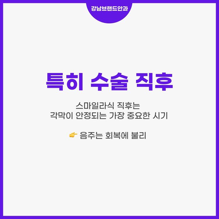 술은 단순히 눈과 무관해 보이지만, 수술 직후에는 여러 문제를 일으킬 수 있습니다. 혈관 확장 → 충혈, 염증 악화 눈 건조 증상 심화 회복 과정 지연 안약 효과 감소 특히 스마일라식 직후에는 각막이 안정되는 중요한 시기이기 때문에 음주는 회복에 불리하게 작용할 수 있습니다.