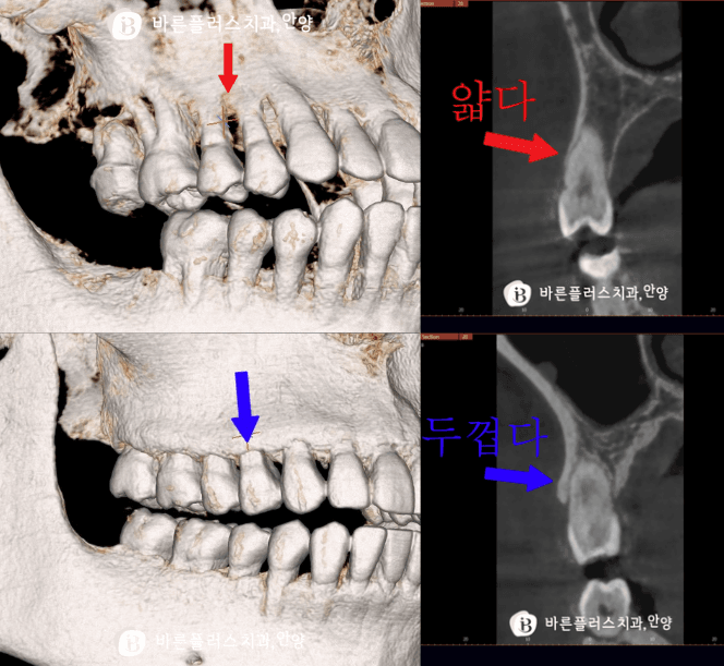 좀더 자세한 3D단면에서 뼈의 두께 차이가 잇몸 벗겨짐과 관련성이 있음을 확인할 수 있습니다.