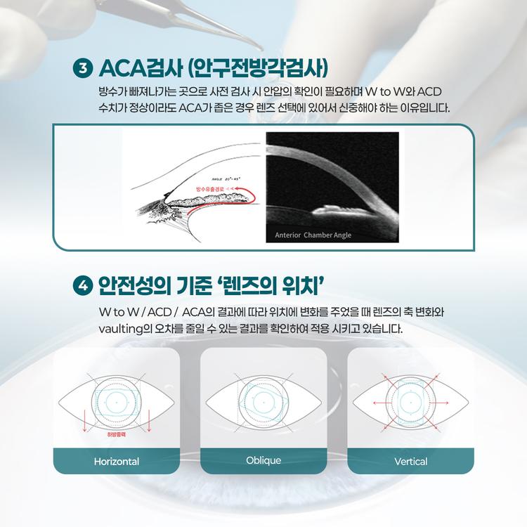 눈 속 방수가 빠져나가는 통로인 전방각의 넓이를 확인합니다. 전방각이 너무 좁으면 수술 후 안압 상승 위험이 있어 렌즈 선택에 신중해야 합니다.