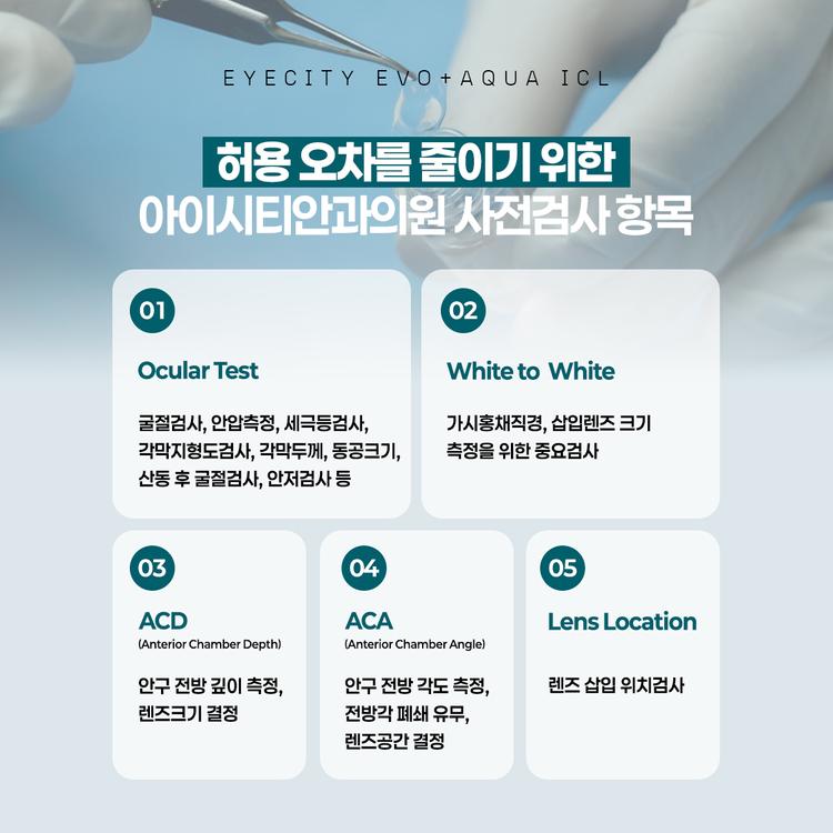 안내렌즈삽입술(EVO+ AQUA ICL)이란? 시력교정수술을 고민할 때 가장 많이 떠올리는 수술은 라식, 라섹입니다. 하지만 각막이 얇거나 초고도근시, 각막 모양에 이상이 있는 경우에는 레이저로 각막을 절삭하는 수술이 어렵거나 제한될 수 있습니다. 이런 분들을 위한 또 하나의 시력교정 방법이 바로 👉 안내렌즈삽입술(ICL, Implantable Collamer Lens) 입니다. 안내렌즈삽입술은 눈 안에 특수 렌즈를 삽입하여 시력을 교정하는 방식으로, 각막을 깎지 않기 때문에 각막 조건이 좋지 않은 경우에도 고려할 수 있는 수술입니다. 특히 최근 사용되는 EVO+ AQUA ICL은 기존 ICL의 장점을 유지하면서도 안전성과 편의성을 한층 더 발전시킨 렌즈입니다.