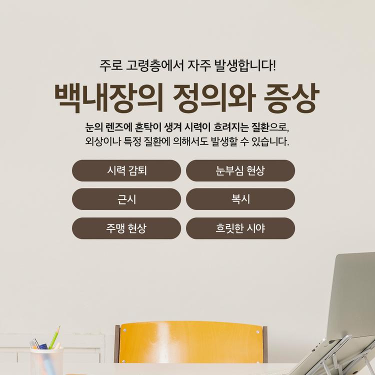 우리는 일상생활에서 시각에 많은 의존을 하고 있기 때문에, 시각 건강을 관리하는 것은 매우 중요합니다. 특히 나이가 들면서 또는 외부적인 원인으로 인해 발생할 수 있는 백내장은 많은 사람에게 시력 저하나 불편을 초래할 수 있는 흔한 질환 중 하나인데요. 백내장을 방치하면 일상생활에 큰 영향을 미치는 것은 물론 치료 시기를 놓치면 실명까지 초래될 수 있으므로 이에 대한 올바른 이해와 적절한 관리가 필요합니다. 오늘은 백내장 수술이 필요할 수 있는 백내장에 대해서 다뤄보도록 하겠습니다.