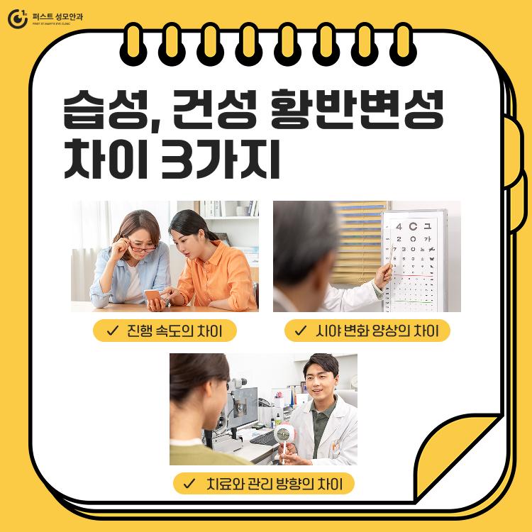 ① 진행 속도 🔸건성: 서서히 진행 🔹습성: 짧은 기간 내 변화 가능 ② 시야 변화 양상 🔸건성: 중심이 점점 흐려짐 🔹습성: 글자 왜곡, 찌그러짐이 뚜렷 ③ 치료·관리 방향 🔸건성: 정기적인 관찰 중심 🔹습성: 상태에 따라 적극적 치료 필요 이 세 가지가 가장 큰 차이입니다.