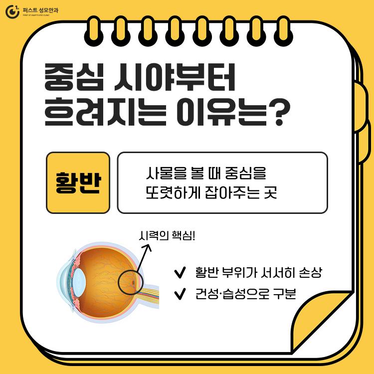 황반은 사물을 볼 때 가장 중심을 또렷하게 인식하는 부위입니다. 이 부위에 변화가 생기면 주변은 비교적 잘 보이는데 가운데만 흐리거나 찌그러져 보일 수 있습니다. 황반변성은 이 황반 부위가 점차 손상되는 질환이며 형태에 따라 건성과 습성으로 나뉩니다.