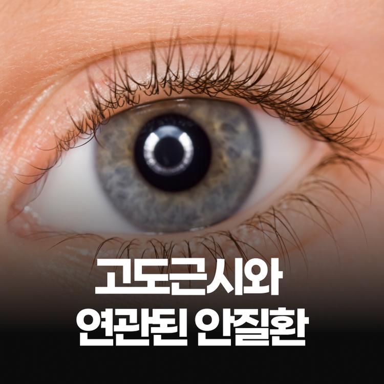 고도근시는 다음과 같은 다양한 안질환과 밀접한 관련이 있습니다. 1️⃣망막박리 눈이 길어지면서 망막이 얇아지고 쉽게 찢어질 수 있는 상태가 되는데, 이로 인해 망막이 부분적으로 또는 전체적으로 떨어지는 망막박리 위험이 커질 수 있는데요. 망막박리는 초기 증상을 놓치기 쉬우며, 적절한 시기에 치료하지 않으면 시력을 영구적으로 잃을 수 있어 정기적인 검진이 필요해요. 2️⃣황반변성 황반은 중심시력을 담당하는 부위로, 고도근시에서는 황반 부위에 '변성'이 일어나 시야가 흐릿해지거나 왜곡되는 증상이 나타날 수 있습니다. 특히 고도근시성 황반변성은 연령에 상관없이 발생할 수 있어 청년층도 안심할 수 없어요. 3️⃣녹내장 고도근시 환자에서는 '시신경이 약해져 있는 경우'가 많고, 안압 변화에 민감하게 반응할 수 있어 녹내장이 발생할 확률이 높은데요. 녹내장은 초기에는 자각증상이 거의 없기 때문에 정기적인 시야 검사와 안압 측정이 중요합니다.