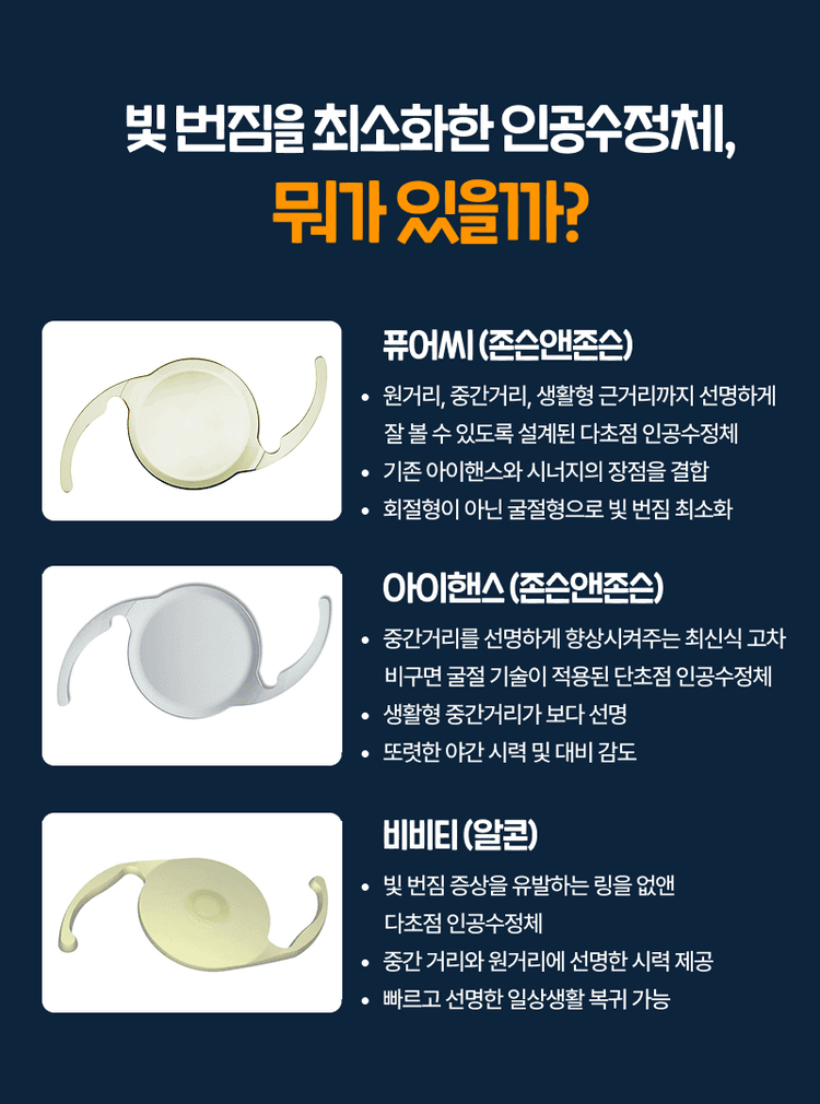 빛 번짐을 최소화한 인공수정체로는 퓨어씨(PureSee), 아이핸스(I-Hance), 비비티(Vivity)가 있습니다. 1️⃣‘퓨어씨’ 2024년 4월 ‘존슨앤존슨’사에서 출시된 인공수정체로, 연속 초점 기술 (EDOF)라는 기술을 적용하여 초점 전환이 자연스러워 어지러움이나 울렁거림이 감소되었다는 특징이 있습니다. 원거리, 중간거리는 물론 생활형 근거리까지 선명한 시야를 제공하며, '회절링' 없이 투명하게 설계돼 달무리 현상과 빛 번짐 발생률도 낮은 편인데요. 👉회절링이란? 다초점 인공수정체는 일반적으로 인공수정체에 근거리에 초점을 맺히게 하기 위해 회절고리(회절링)가 존재. 높은 대비 감도로 어두운 밤에도 밝은 시야를 제공할 수 있는 렌즈로, 명암 대비를 확실히 하고 눈의 피로도를 감소하는 효과가 있습니다. 렌즈 내 블루 라이트 차단 기능이 탑재되어 있어 해로운 빛으로부터 망막을 보호할 수 있다는 장점이 있어요. ⚠️하지만 아주 작은 글씨를 보는 경우, 또는 시계 수리를 하는 등의 초 근거리 작업을 하는 경우 적합하지 않으며 얇은 돋보기를 착용해야 할 수도 있습니다. 2️⃣‘아이핸스’ 존슨앤존슨에서 출시된 인공수정체로, 기존 단초점 렌즈와 달리 근거리와 중간거리가 향상된 프리미엄 단초점 혹은 준다초점 렌즈라고 보시면 됩니다. 빛 번짐이나 눈부심과 같은 문제도 많이 없는 편으로, 야간 운전을 할 때 혹은 야간 독서 시에 얇은 돋보기를 껴도 잘 보입니다. 또한 수술 후의 적응 기간도 짧기 때문에 원거리와 중간 거리는 아주 빨리 0.8 이상~1.0 이상 도달할 수 있어 많은 주목을 받고 있는 렌즈인데요. 망막 질환, 녹내장 등 안질환이 있거나 구불구불하게 사물이 휘어져 보이는 ‘변시증’ 증상이 있는 분들에게 해당 렌즈와 같은 프리미엄 단초점 렌즈를 고려해볼 수 있어요. 기존 단초점 렌즈의 한계를 보완한 제품으로, 회절 링이나 굴절존이 없는 디자인을 통해 빛 번짐을 줄였으며, 중간 거리까지 선명한 시력을 제공합니다. 아이핸스는 독서나 컴퓨터 사용 시에도 비교적 편안한 시야를 제공하여 근거리 작업이 많은 분들에게 적합해요. 그럼 같은 회사에서 출시된 '퓨어씨'와 '아이핸스'는 각각 어떤 경우에 적합할까요? '아이핸스'는 컴퓨터 거리 정도의 중간거리 시력이 중요하거나, 빛 번짐이나 눈부심에 극도로 예민한 분들에게 추천 드리고 있는데요. 반면에 '퓨어씨'는 원거리, 중간거리 뿐만 아니라 근거리에 대한 니즈가 강한 분들, 야간 시력이 중요하며 대비 감도도 중요하여 기존 다초점 렌즈의 야간 시력 감소나 야간 빛 번짐 현상이 걱정되셨던 분들께 추천 드려요. 3️⃣‘비비티’ 알콘사에서 출시되어 연속 초점 기술이 적용된 렌즈로, 우리가 독서하는 30cm 거리 정도는 조금 부족하고 40cm에서의 생활형 근거리부터 60cm~80cm 정도의 중간거리 그리고 원거리까지 자연스럽게 잘 보인다는 장점이 있습니다. 특히 '비비티'는 렌즈 중심의 미세한 융기를 통해 근거리를 강조하고 있어 양안을 같이 수술했을 때 눈이 편안하다는 피드백도 많은 편입니다. 기존 다초점 렌즈보다 더 넓고 연속적인 시야를 제공하기 때문에, 평소 다초점 렌즈에 대한 니즈가 있었지만 야간 빛 번짐이나 기타 여러 이유로 망설였던 분들에게 좋은 선택지가 될 수 있어요. 👉융기의 장점? 빛 번짐 증상을 유발하는 링 부분을 없애고, 광학부 표면에 현미경으로 관찰 가능한 미세 융기를 만들어 렌즈에 파면(wavefront)을 늘림. 이로 인해 초점 거리를 확장함으로써 원거리에서 중간 거리까지 확장된 시야를 제공. ⚠️다만, 비비티 렌즈는 프리미엄 단초점 인공수정체보다는 여전히 빛 번짐이 존재하는데요. 또한 다초점 렌즈임에도 불구하고 다른 회절링이 있는 렌즈들에 비해서 근거리에 불편함이 있을 수도 있으므로, 초 근거리 작업 시엔 얇은 돋보기 착용이 필요할 수도 있어요.