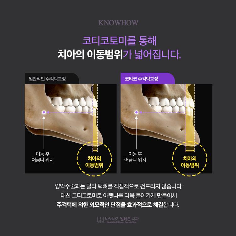 이전에 설명해드린 것처럼, 코티코토미 시술이 병행된 교정 방식은 골격의 전후적 부조화에 기인한 외모적 콤플렉스를 해결하는 절충치료의 효과를 대폭 향상시킬 수 있습니다. 조금 더 직관적으로 말씀 드리자면, 턱뼈를 직접적으로 건드리지 않고 잇몸뼈를 유연하게 만드는 정도에서 윗니와 아랫니를 더 많이 움직이는 방법이라고 볼 수 있겠습니다. 하지만 분명한 것은 절충치료로 기대할 수 있는 얼굴 변화에도 한계가 있다는 점입니다. 코티코토미가 그 한계의 상한선을 더 높이긴 하지만, 그래도 불가능한 영역이 존재합니다. 아래턱의 크기가 지나치게 크거나, 턱뼈 길이의 좌우 비대칭이 심한 경우가 바로 그런 케이스에 해당합니다. 이런 경우에는 양악수술이 오히려 더 바람직하다고 볼 수 있습니다. 하지만 이런 부분을 환자 스스로 찾아보고 가늠하여 판단하는 것은 대단히 위험합니다. 양악수술 자체의 위험도도 높을 뿐더러, 잘못하면 이전으로 돌아가기가 어렵기 때문입니다. 그렇기 때문에 인터넷이나 카페 등을 찾아보고 섣불리 결정하시는 것보다는, 풍부한 경험을 갖춘 치과교정과 전문의로부터 정밀한 진단과 상담을 받아보시길 권장해드리는 바입니다.