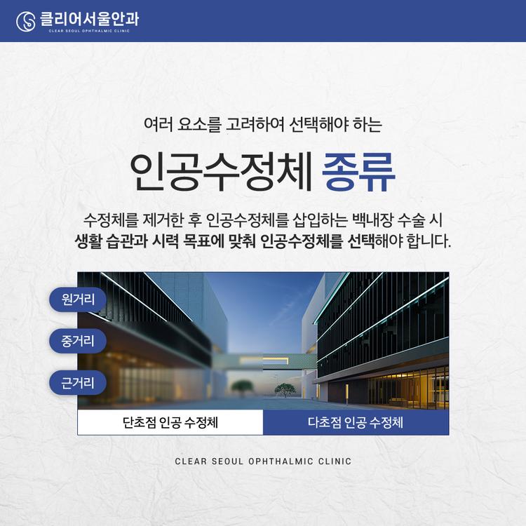 백내장 수술은 혼탁해진 수정체를 제거한 뒤, 그 자리에 인공수정체(IOL)를 삽입하는 방식으로 진행됩니다. 이때 결정하는 인공수정체의 종류에 따라 이후 시력의 질과 일상생활의 편의성이 크게 달라질 수 있으므로, 자신의 생활 습관과 시력 목표에 맞춰 신중하게 결정하는 것이 중요합니다. 단초점 렌즈 - 한곳(주로 원거리)에 초점을 맞춰주는 렌즈입니다. 먼 거리 시야 확보에 적합해 TV 시청, 운전 등 일상 속 활동에서 유용할 수 있는데요. 하지만 근거리에는 초점이 맞지 않기 때문에 책을 보거나 스마트폰을 사용할 때는 돋보기를 써야 할 수도 있습니다. 빛 번짐이 적고 대비감이 비교적 안정적인 것이 특징입니다. 다초점 렌즈 - 원거리, 중간 거리, 근거리까지 폭넓게 시야 확보에 도움을 줄 수 있습니다. 안경 착용 빈도를 줄이고 싶거나, 가까운 거리에서 활동이 많은 경우 적합할 수 있는데요. 단, 구조적 특성상 빛이 분산되기 때문에 눈부심이나 빛 번짐을 느낄 수 있으며, 일부는 적응 기간이 필요할 수 있습니다. 무엇보다 선택 시에는 개인의 직업, 취미, 운전 여부, 밤 시간 활동, 안경 착용 선호도 등을 고려해 의료진과 충분히 상담한 후 결정하는 것이 중요한데요. 백내장은 누구에게나 생길 수 있는 시력 질환이지만, 조기에 진단하고 수술 여부를 판단하면 시야 회복은 물론 일상의 불편함도 줄일 수 있습니다. 증상이 느껴지기 시작했다면 눈 상태를 진단받고, 적합한 수술 시기와 인공수정체 선택 방향에 대해 상담해 보는 것이 좋은데요. 특히 렌즈 선택은 수술 후 삶의 질과 직결되므로, 본인의 생활 방식과 시력 목표에 맞춰 신중하게 결정하는 것이 좋습니다. 이러한 점들을 고려하여 의료진과의 충분한 소통을 통해 자신에게 적합한 선택을 하시기를 바랍니다.