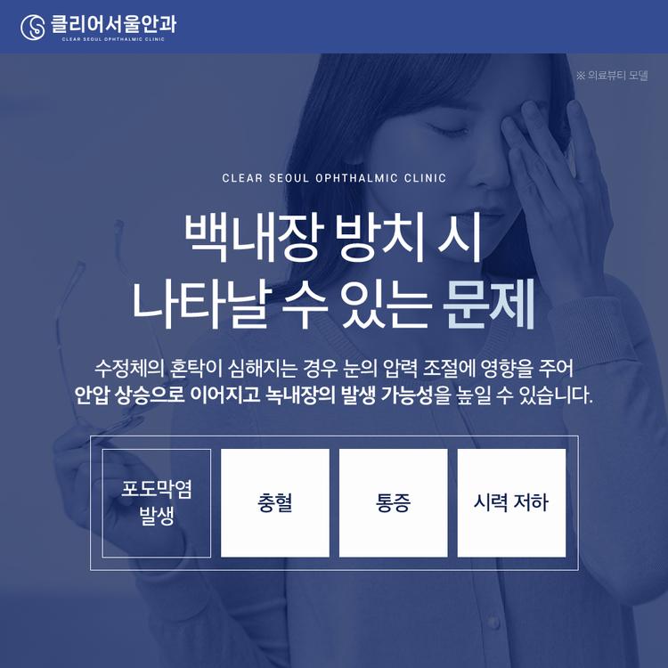 백내장을 단순히 ‘눈이 잘 안 보이는 문제’로 여기고 치료를 늦추면 다양한 문제가 생길 수 있습니다. 수정체의 혼탁이 심해지면 눈 안의 압력 조절에 영향을 주어 안압 상승으로 이어질 수 있고, 이에 따라 녹내장이 생길 가능성이 있는데요. 녹내장은 시신경이 손상되는 질환으로, 제때 조치하지 않으면 시야 손실로 이어질 수 있습니다. 또한 혼탁해진 수정체로 인해 눈 안에서 염증 반응이 유발되어 포도막염이 발생할 수 있으며, 이에 따라 충혈, 통증, 시력 저하 등의 증상이 동반될 수 있는데요. 따라서 백내장은 조기에 진단하고 대응하는 것이 시력 건강 유지에 도움이 될 수 있습니다.