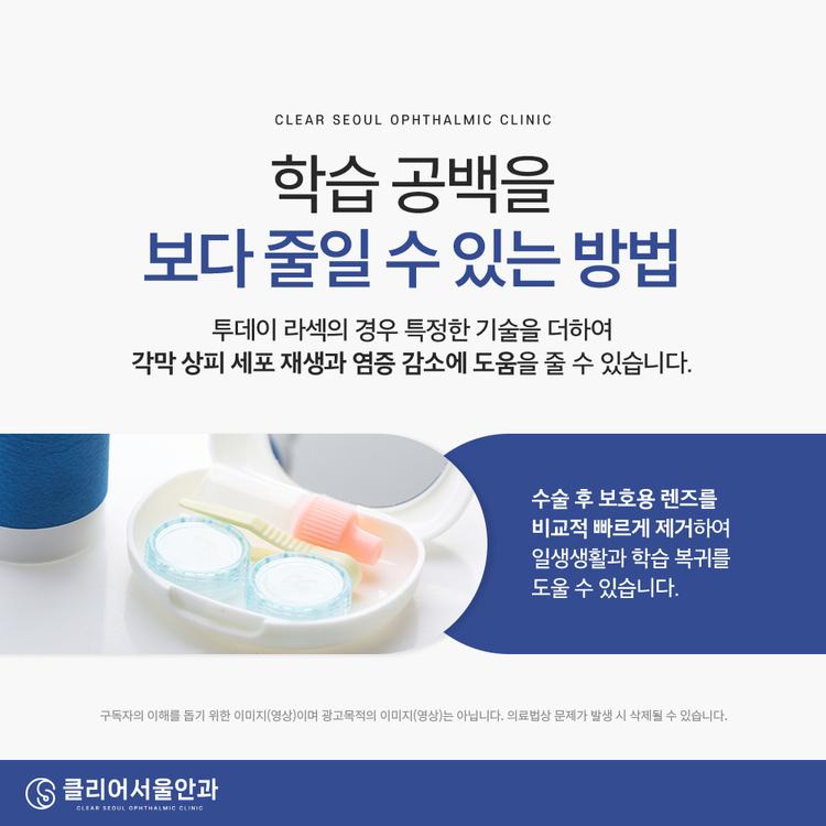 수험생이 시력 개선을 고려할 때, 학업 공백을 줄일 수 있는 회복 기간은 매우 중요한 부분입니다. 투데이 라섹은 일반적인 시력 교정술 중 하나인 라섹의 한 종류로, 시술 후 보호용 렌즈를 착용하는 기간에 차이가 있을 수 있습니다. 이 방법은 각막 표면을 벗겨내고 레이저를 조사한 뒤 자연스럽게 회복되기를 기다리는 라섹의 기본 원리로 여기에 특정한 기술을 더하여 각막 상피 세포의 재생을 돕고, 염증 반응을 줄이는 데 도움을 줄 수 있습니다. 일반적인 라섹은 보통 5~7일 정도 보호용 렌즈를 착용해야 하는 경우가 많은데요. 반면, 투데이 라섹은 2일 정도만 렌즈를 착용한 후 빠르게 제거하여 일상생활과 학습으로의 복귀에 도움을 줄 수 있습니다. 이러한 장점은 중요한 시험을 앞두고 학업 공백을 줄여야 하는 수험생들에게 고려될 수 있는 장점으로 작용할 수 있습니다.