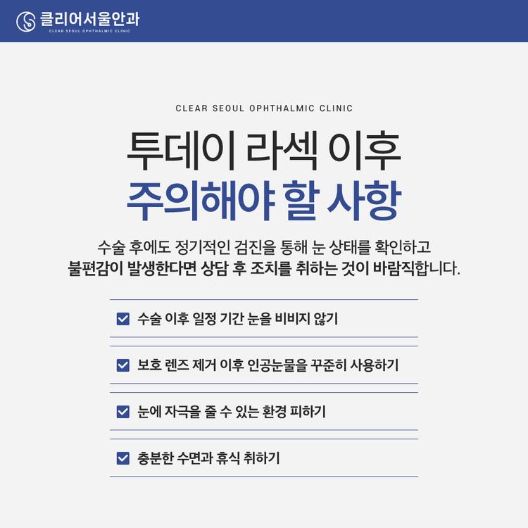 어떤 시력 개선 시술이든, 시술 후 관리는 좋은 결과를 얻는 데 영향을 주는 중요한 부분입니다. 특히 투데이 라섹 시술 후에는 다음과 같은 주의 사항을 꾸준히 지키는 것이 권장됩니다. 시술 초기 2일 동안은 눈을 비비지 않도록 특히 신경 써야 합니다. 눈을 비비는 행동은 각막 상피 회복을 방해하거나 감염 위험을 높일 수 있기 때문인데요. 렌즈를 제거한 후에는 눈이 건조하게 느껴질 수 있으니, 안내받은 대로 인공눈물을 꾸준히 사용하는 것이 눈 건강 유지에 이로울 수 있습니다. 또한, 먼지, 담배 연기, 자외선 등 눈에 자극을 줄 수 있는 환경은 가능한 피하고, 밝은 화면을 장시간 보는 것을 자제하는 것이 좋은데요. 충분한 수면과 휴식을 통해 눈이 회복할 시간을 주는 것도 잊지 말아야 합니다. 시술 후에도 정기적인 안과 검진을 통해 눈 상태를 주기적으로 확인하고, 혹시라도 불편한 점이 있다면 지체 없이 의료진과 상담하는 것이 바람직한데요. 수능을 앞둔 수험생들에게 시력은 컨디션과 학습 능률에 큰 영향을 미치는 요소입니다. 여러 시력 개선 방법을 통해 불편함을 덜어내고, 오랫동안 준비해온 노력이 좋은 결실을 맺을 수 있도록 눈 건강을 세심하게 관리하시길 바랍니다.