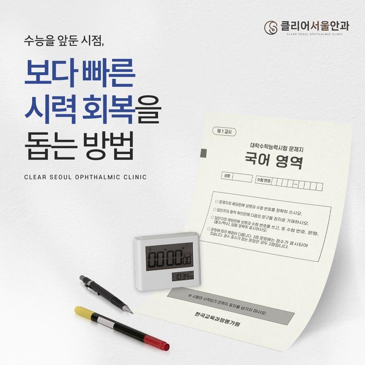 수능을 앞둔 수험생들에게 눈 건강과 시력은 매우 중요한 부분입니다. 오랜 시간 책을 읽고 문제를 풀며, 컴퓨터 모니터를 사용하는 과정에서 눈의 피로가 쌓여 시력에 대한 부담이 커질 수 있죠. 안경이나 콘택트렌즈를 사용한다면 공부 중 지속적인 불편함을 느끼거나 집중력이 흐트러지는 원인이 될 수 있어, 시력 개선에 대한 고민이 깊어지는 시기이기도 한데요. 이러한 불편함을 그대로 두기보다는, 수능 준비에 좋은 영향을 줄 수 있도록 적절한 눈 관리를 고민해 보는 것이 필요합니다.