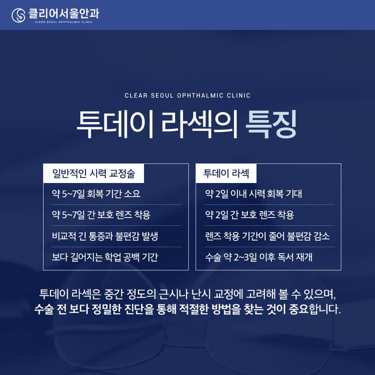 라섹 중 일반 라섹과 투데이 라섹은 회복 과정에서 몇 가지 차이를 보일 수 있습니다. | 구분 | 일반 라섹 | 투데이 라섹 | | 회복 속도 | 5~7일 소요 | 2일 이내 시력 회복 기대 | | 보호 렌즈 착용 기간 | 5~7일 | 약 2일 | | 초기 통증/불편감 | 비교적 길게 느껴질 수 있음 | 착용 기간 단축으로 줄어들 수 있음 | | 학습 복귀 시점 | 학업 공백 기간이 더 길어질 수 있음 | 시술 후 2~3일 정도면 독서 등 학습 가능 | 회복 속도 측면에서 투데이 라섹은 시술 후 2일 안에 어느 정도 시력 회복을 기대할 수 있어, 눈의 피로감을 덜고 독서나 모니터 작업이 비교적 빠르게 가능해질 수 있습니다. 반면 일반 라섹은 회복에 5~7일 정도의 기간이 필요한 경우가 많아 학업 공백이 더 길어질 수 있습니다. 통증이나 불편감에 있어서도 투데이 라섹은 보호용 렌즈 착용 기간이 짧기 때문에 초기 통증이나 이물감을 줄이는 데 유리할 수 있습니다. 보호 렌즈를 오래 착용할 때 느낄 수 있는 답답함이나 건조함 같은 불편함도 비교적 짧게 경험한다는 점이 다릅니다. 학습 복귀 시점은 수험생에게 아주 중요한데요. 투데이 라섹은 시술 후 2~3일 정도면 독서나 문제 풀이 같은 집중적인 학습이 가능한 수준으로 시력이 개선될 수 있어, 시간 관리 면에서 긍정적인 영향을 줄 수 있습니다. 이러한 점들을 고려했을 때, 투데이 라섹은 심한 고도근시보다는 중간 정도의 근시나 난시 교정에 적합할 수 있으며, 오랫동안 콘택트렌즈를 착용하면서 불편함을 느꼈던 수험생들에게 고려될 수 있는 시력 개선 방법의 하나입니다. 수험생라식을 염두에 둔다면, 이러한 특징들을 바탕으로 자신에게 적합한 방법을 신중하게 알아보는 것이 바람직합니다.