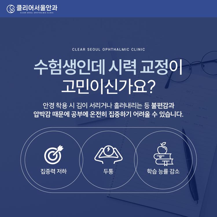 수험생들의 눈은 다른 때보다 더 많은 부담을 안고 있습니다. 빼곡한 글씨로 가득한 교재를 보며 보내는 긴 시간, 많은 문제를 풀어야 하는 모니터 작업 등은 눈의 피로를 깊게 만드는 주요 요인인데요. 안경을 착용하면 김이 서리거나 흘러내리는 불편함, 코나 귀의 압박감으로 인해 공부에 온전히 집중하기 어려울 때가 있습니다. 또한, 콘택트렌즈는 건조함이나 이물감 때문에 눈이 쉽게 피로해지고 충혈되는 등의 어려움을 겪을 수 있는데요. 이러한 시력과 관련된 불편함은 단순히 눈만의 문제가 아닙니다. 집중력 저하, 두통, 학습 능률 감소로 이어질 수 있으므로, 그냥 넘기기보다는 자신에게 적합한 시력 개선 방안을 적극적으로 고려해 보는 것이 중요합니다.