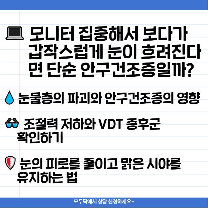직장인이나 학생들은 하루 중 대부분의 시간을 컴퓨터나 스마트폰 화면을 보며 보냅니다. 모니터에 집중하다 보면 어느 순간 눈앞이 뿌옇게 흐려지거나 초점이 잘 맞지 않는 경험을 하게 되는데요. 많은 분이 이를 단순한 피로나 안구건조증으로 생각하고 넘기지만, 사실 이는 눈이 보내는 복합적인 이상 신호일 수 있습니다.