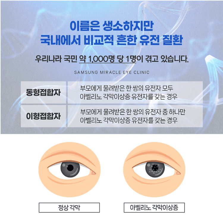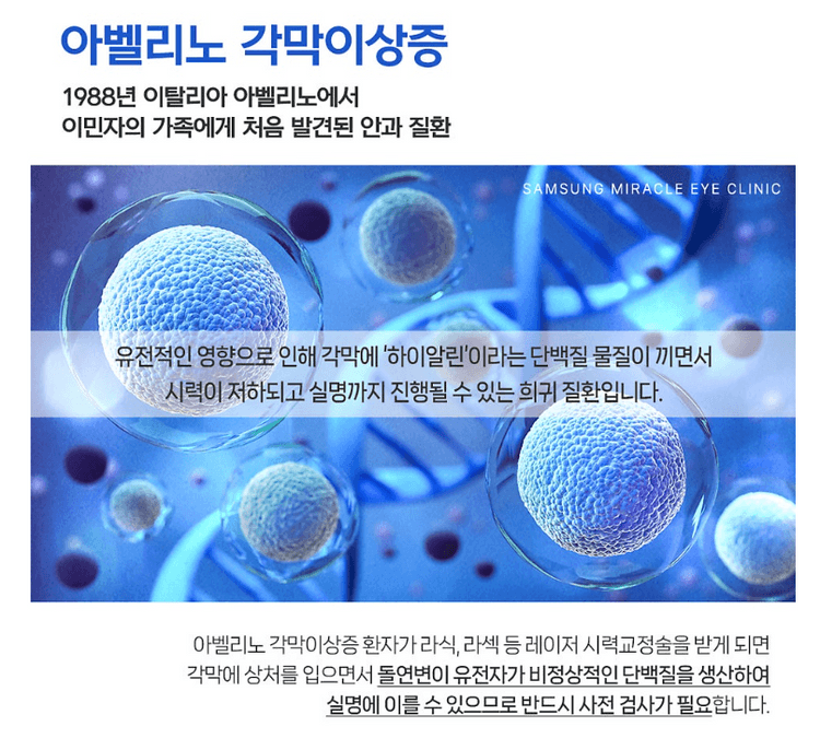 아벨리노 각막이상증은 1988년 이탈리아 아벨리노에서 이민자의 가족에게 처음 발견된 안과 질환입니다. 두드러지는 증상으로는 각막의 중심부가 비정상적으로 침착되거나 얇아지면서 뿌옇게 혼탁되는 특징이 있어요. 문제는 아벨리노 각막이상증을 갖고 있는 환자의 경우 시력교정 수술 이후 회복 과정에서 실명의 위험이 뒤따를 수 있다는 점인데요. 때문에 시력교정술을 고려하고 계신다면 수술 전 정밀검사를 통해 본인이 아벨리노 유전자 보유자인지 확인하는 과정이 반드시 필요합니다.