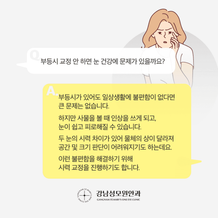 부등시는 초기에는 자각 증상이 적고 불편감이 크지 않을 수 있으나, 시간이 지남에 따라 시력이 좋은 쪽 눈에도 부담이 가중되고 양안 시기능이 저하되며 일상생활에 다양한 불편을 초래할 수 있습니다. 따라서 이러한 문제가 지속되거나 악화될 경우에는 적극적인 시력 교정이 필요한데요. ⚠️부등시는 단순한 시력 불균형에 그치지 않고, 장기적으로는 외안부 정렬 이상(사시처럼 보이는 현상)이나 입체시력 저하로 이어질 수 있기 때문에 조기 발견 및 교정이 중요합니다. 어린 시기에 진단된 경우에는 시력 발달에 맞춰 적극적인 교정치료를 통해 정상적인 시기능 회복이 가능하며, 성인의 경우에도 정확한 진단을 바탕으로 안경·콘택트렌즈 착용 또는 시력교정술을 통해 불편을 줄이고 기능 회복을 도모할 수 있어요. 라식, 라섹 등 굴절교정술을 통한 교정은 근시와 난시의 정도, 시력 차이에 따라 각막 절삭량을 정밀하게 조절하여 양안 시력을 균형 있게 맞추는 방식으로 진행됩니다. 👉다만, 정밀한 안과 검진과 의료진과의 상담을 통해 본인의 눈 상태에 적합한 시력교정 방법을 선택하시길 권장 드려요.