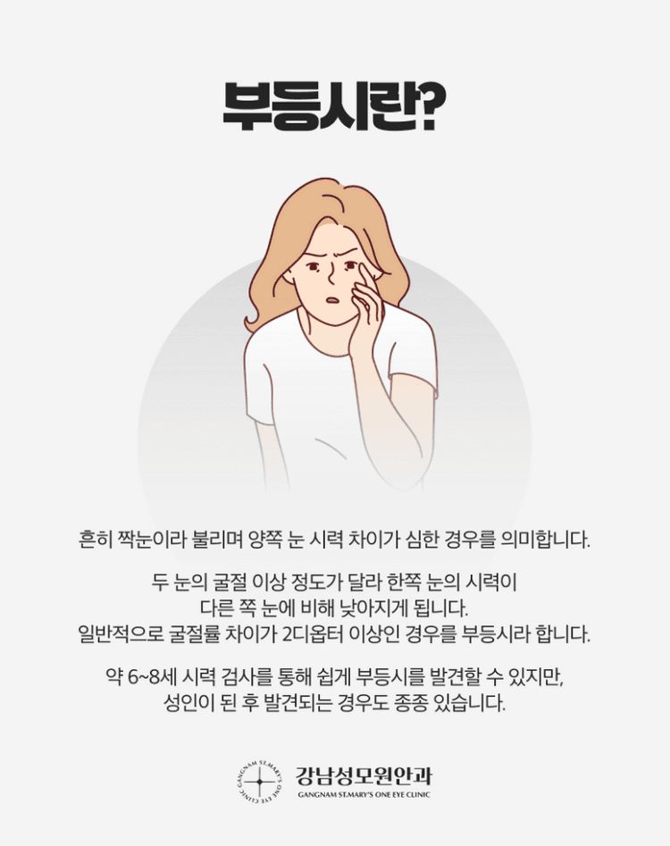 ‘부등시(Anisometropia)’는 양쪽 눈의 굴절 상태에 차이가 있어, 두 눈의 시력에 현저한 불균형이 나타나는 상태를 의미합니다. 흔히 ‘짝눈’이라고도 불리며, 많은 환자분들이 처음 이 용어를 접하거나 정확한 의미를 알지 못한 채 불편함을 경험하는 경우가 많습니다. 부등시는 보통 양안의 굴절력 차이가 2디옵터(D) 이상일 때 진단되며, 한쪽 눈의 시력이 다른 쪽에 비해 뚜렷하게 낮아지는 것이 특징인데요. ⚠️이러한 상태가 지속되면 양안 시기능(두 눈을 동시에 사용하는 기능)에 장애가 발생하고, 시력 발달에 중요한 시기인 유아기·소아기에 제대로 교정되지 않으면 약시(시력 발달 부전)로 이어질 수 있어요. 특히 6~8세 무렵의 시력 검사를 통해 조기에 발견되는 경우가 많으며, 시신경 발달이 완료되는 10세 전후까지 적절한 시력 교정이 이루어지면 영구적인 부등시 또는 약시로의 진행을 효과적으로 예방할 수 있습니다. 반면, 성인기에 진단되는 부등시는 대부분 소아기부터 장기간 방치된 결과로, 안경이나 콘택트렌즈 착용 또는 시력교정술을 통해 시기능 불균형에 의한 불편함을 완화할 수 있어요. 부등시가 항상 증상을 유발하는 것은 아니며, 일상생활에 큰 지장을 주지 않는 경우도 있는데요. 그러나 다음과 같은 증상이 동반된다면 정확한 검진과 교정 치료가 필요해요. ▪사물을 볼 때 인상을 쓰거나 눈을 자주 찡그리는 습관 ▪눈의 피로, 두통, 집중력 저하 ▪거리나 크기 판단의 어려움, 입체감 저하 🔎부등시의 유형은 크게 4가지로 분류됩니다. ▪단순 근시성 부등시: 한쪽 눈은 정시(정상 시력), 반대쪽 눈은 근시인 경우 ▪복합 근시성 부등시: 양쪽 눈 모두 근시이지만 굴절 정도에 차이가 있는 경우 ▪복합 원시성 부등시: 양쪽 눈 모두 원시이지만 시력 차이가 존재하는 경우 ▪이종 굴절 부등시: 한쪽 눈은 원시, 다른 쪽 눈은 근시를 가진 경우 부등시의 원인과 굴절 이상 유형에 따라 교정 방법이 달라질 수 있으므로, 반드시 안과에서 정밀 검진을 통해 본인의 상태를 정확히 진단받고 적절한 교정 방안을 계획해야 합니다.