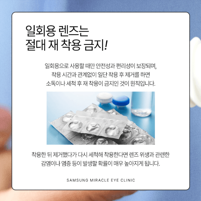 일반적으로 하루 콘택트렌즈 착용 권장 시간은 8시간인데, 그중 일회용 렌즈는 착용 시간과 관계없이 일단 착용 후 제거를 하면 소독이나 세척 후 재 착용이 금지인 것이 원칙입니다. 일회용 렌즈는 일회용으로 사용할 때만 안전성과 편리성이 보장되는 렌즈로, 착용한 뒤 제거했다가 다시 세척해 착용한다면 렌즈 위생과 관련한 감염이나 염증 등이 발생할 확률이 매우 높아지게 됩니다.