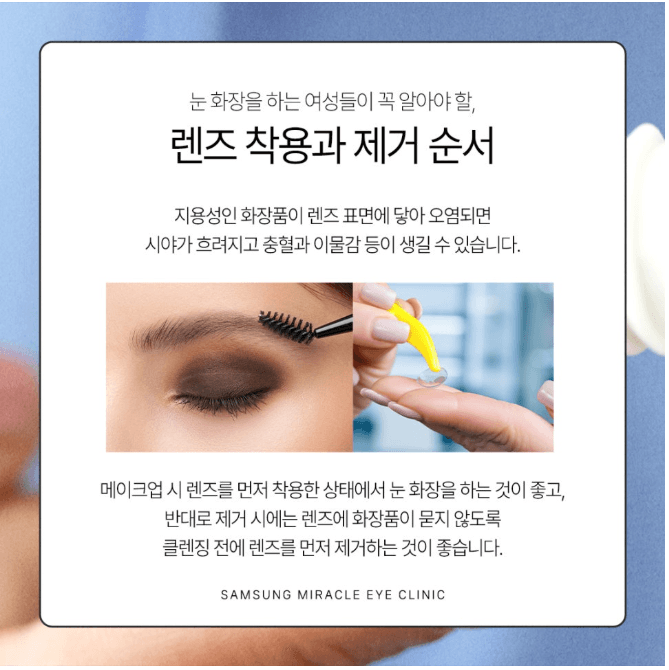 콘택트렌즈를 착용할 때는 누구나 눈꺼풀을 만지게 되고, 착용을 하고 나서는 눈을 깜박이며 제자리에 위치하도록 하는 게 일반적인데, 만약 눈 주변에 화장품이 묻은 상태에서 렌즈를 착용하게 된다면 어떨까요? 당연하게도 그 과정에서 렌즈와 눈 안으로 화장품이 함께 들어가게 되겠습니다.